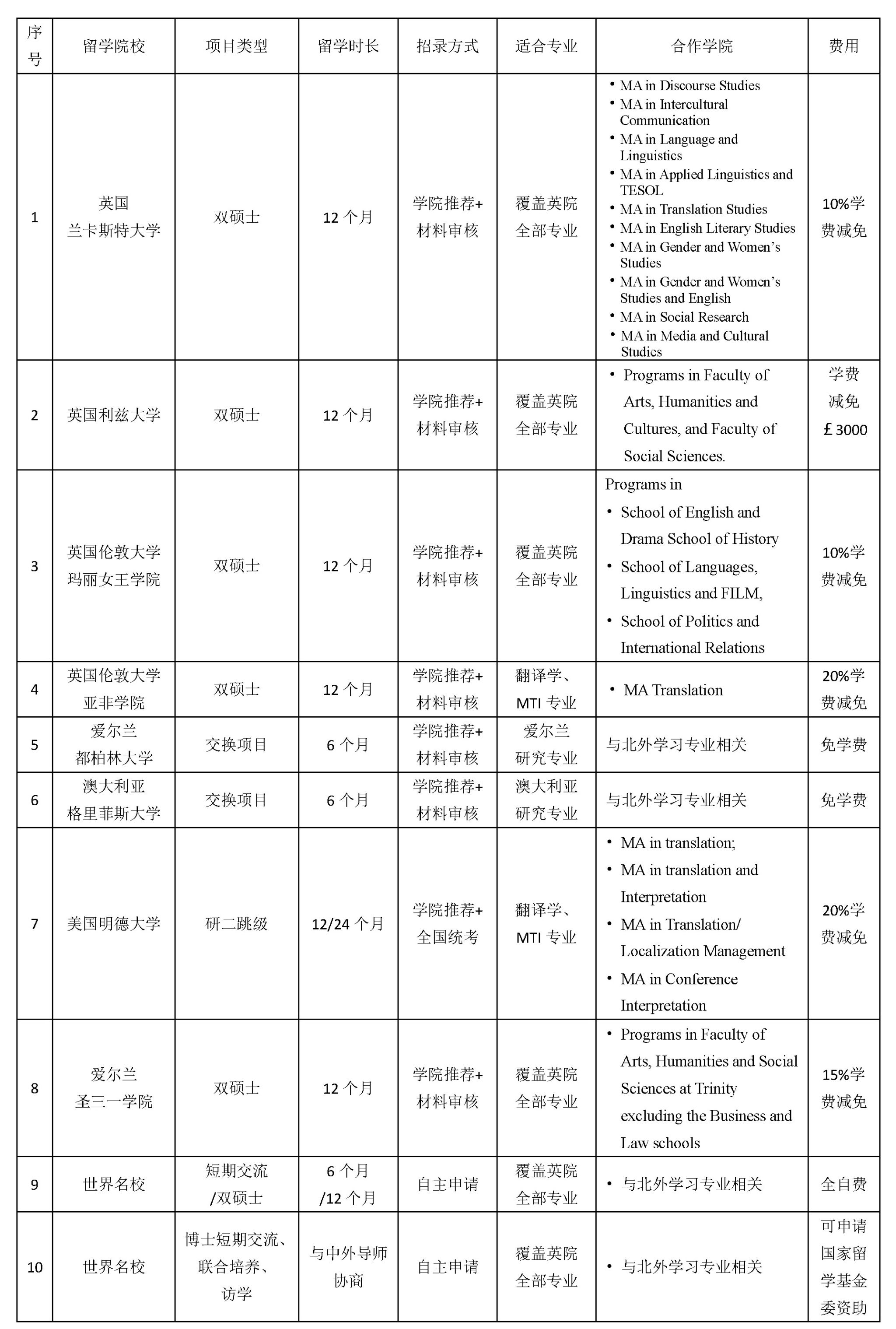 pg国际电子网站研究生(含硕士生和博士生)短期留学项目旨在培养国际化复合型人才,为学生提供赴世界名校交流学习的机会。硕士生出境交流时间须在完成一年学习之后根据具体情况确定,博士生须与导师商量后确定。短期留学项目注重夯实学生专业功底,提升学生的专业素养、跨学科能力及国际竞争力,助力学生全面发展。学生在外就读专业与北外在读专业相关,所修学分得到认可,可计入毕业学分。各项目简要介绍请参见下表。