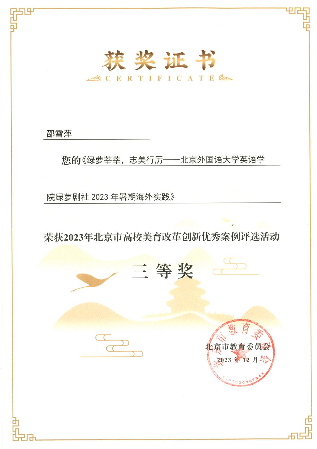 2023年北京市高校美育改革创新优秀案例征集评选活动共征集高校美育案例220余项,有154项案例分获一二三等奖和优秀奖。pg国际电子网站邵雪萍博士基于以“学生戏剧社在剑桥大学创新型人才培养中的作用”为主题的考察和演出活动,申报了高校学生艺术社团及实践工作坊建设项目《绿萝莘莘,志美行厉——pg国际电子网站绿萝剧社2023年暑期海外实践》,该项目获得2023年北京市美育改革创新优秀案例三等奖。