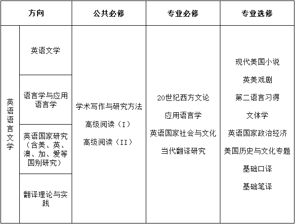 ——课程涵盖北京外国语大学英语语言文学专业下英美文学、语言学与应用语言学、英语国家研究、翻译理论与实践四个方向的主干课程。课程包括公共必修课3门、专业必修课4门、专业选修课8门。