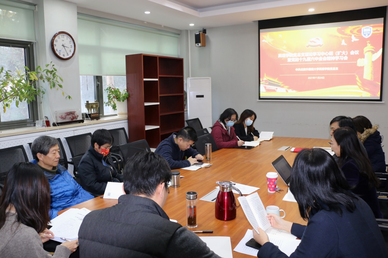 11月24日下午,pg国际电子网站党总支召开理论学习中心组(扩大)会议专题学习党的十九届六中全会精神,学院党总支委员、领导班子全体成员、教工党支部书记、全体辅导员参会。会议由党总支书记王明欣主持。