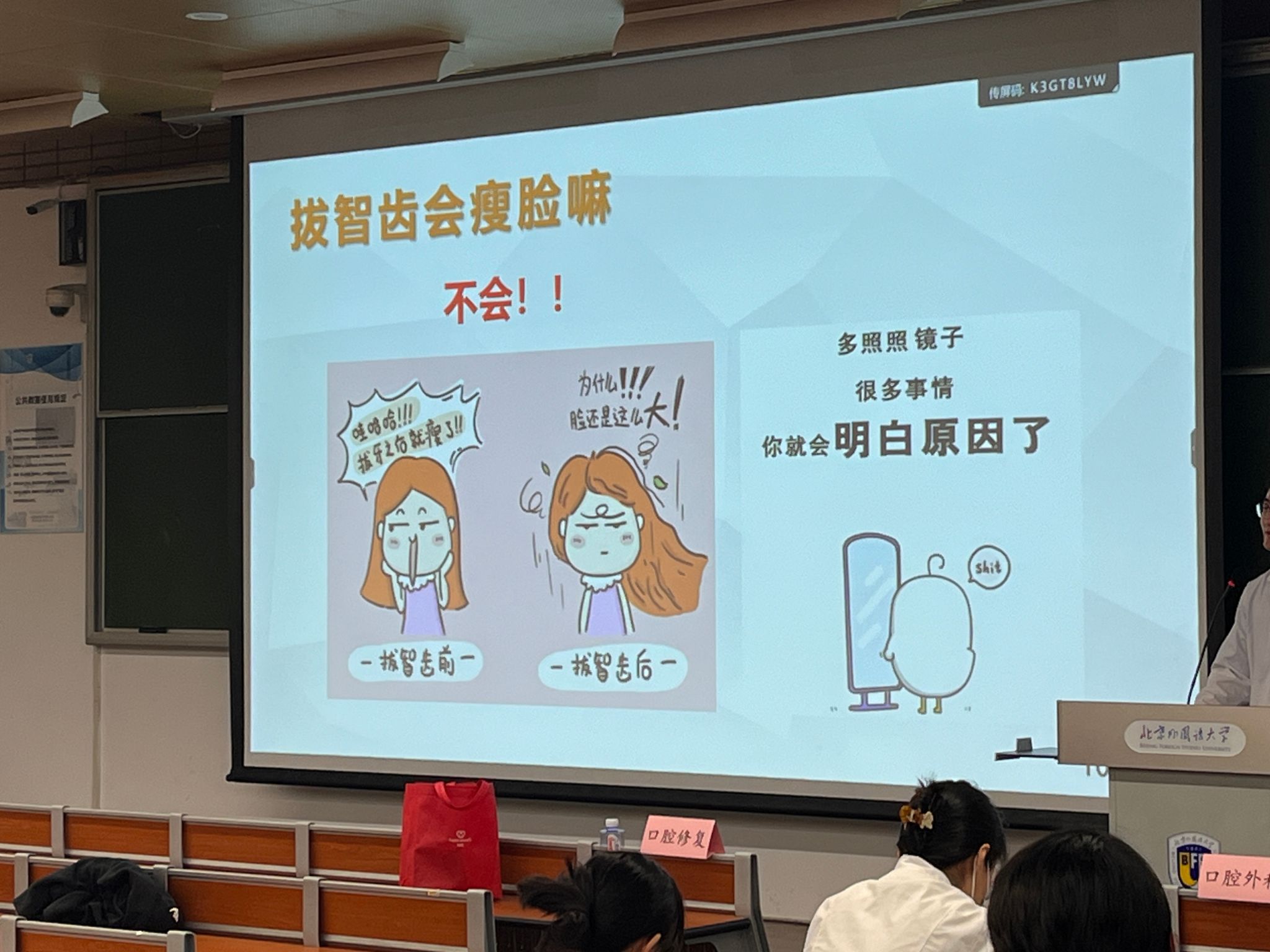 首先pg国际电子网站本科生党支部对北大医学院同学的到来表示热烈欢迎。接下来北大医学院同学分别从口腔清洁与护理、牙齿健康美白、口腔正畸、智齿及口腔内科知识等五个方面进行科普讲座。