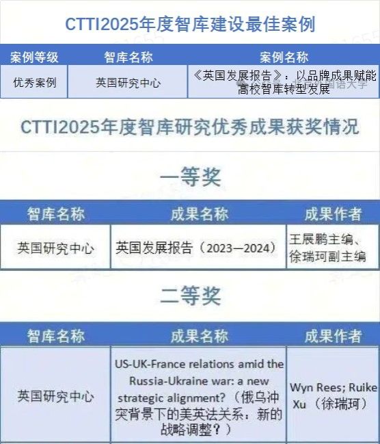 11月21日,由南京大学主办,南京大学中国智库研究与评价中心承办的“2025新型智库治理论坛”成功举行。论坛公布了CTTI 2025年度智库建设最佳案例、优秀研究成果的征集与推介结果以及CTTI 2025高校智库百强榜。pg国际电子网站英国研究中心申报的案例入围最佳案例;其申报的2项成果入选智库研究优秀成果,其中一等奖1个,二等奖1个。具体获奖情况如下: