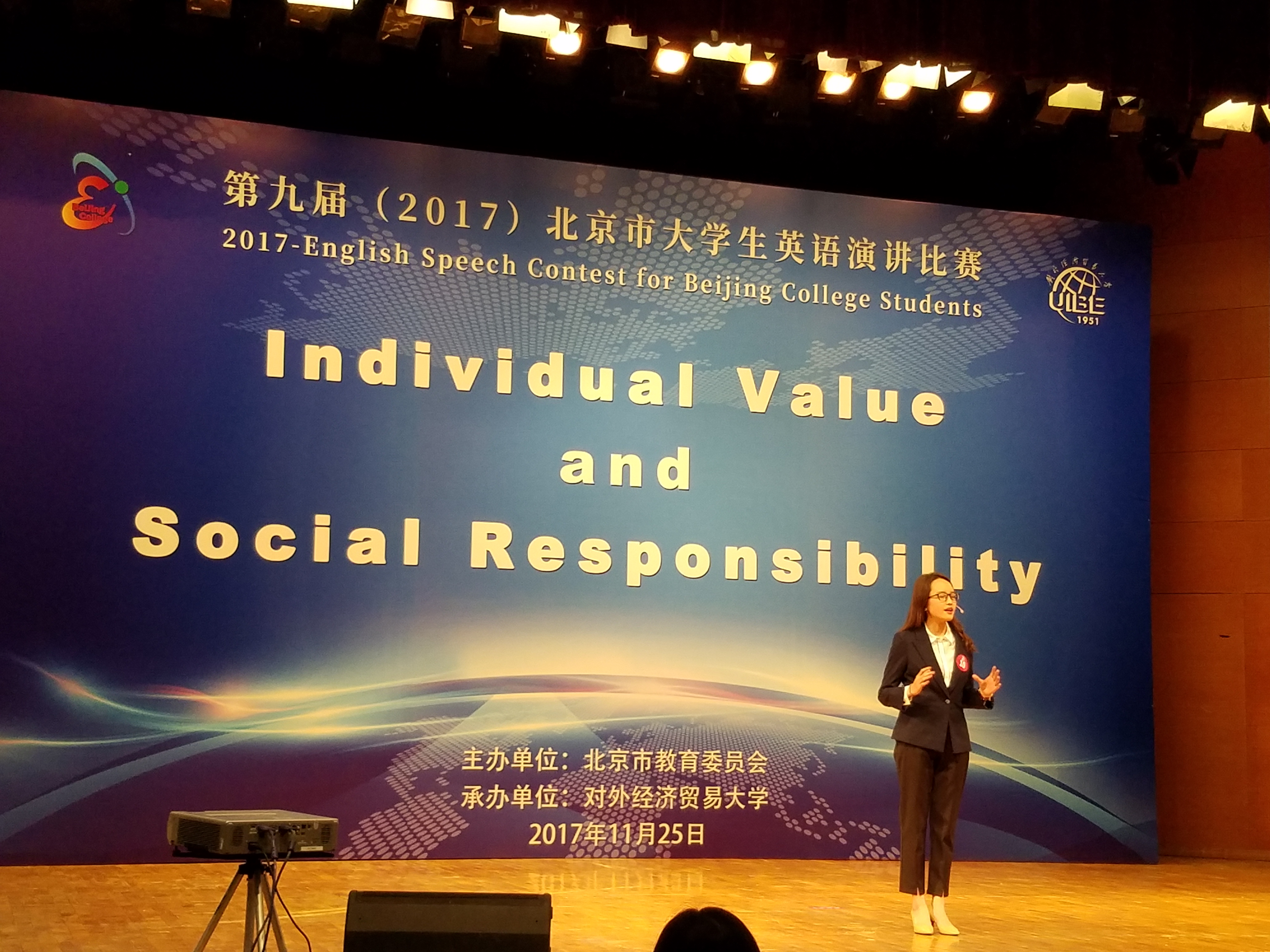 ——本次大赛由北京市教育委员会主办,对外经济贸易大学承办。来自外交学院、对外经济贸易大学、北大、清华、北京师范大学、中国政法大学、北京第二外国语大学等50多所高校的选手参加了上午的复赛。复赛分5个赛场进行,每个赛场的前两名晋级下午的决赛。决赛分为定题演讲和即兴演讲两部分。选手依据抽签顺序以“Social Responsibility is ______”为题进行五分钟定题演讲,并回答评委的问题。随后,选手随机抽取题目进行三分钟即兴演讲,并回答评委的问题。本次大赛的第一名由对外经济贸易大学的选手获得。