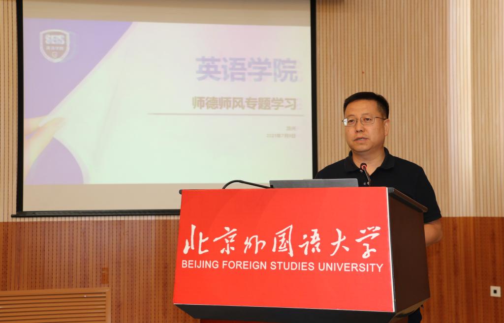党总支书记路兴对学院教职工师德专题学习教育进行部署。会前发放师德专题学习材料,会上分别就学习材料中《北京外国语大学教师职业道德规范》《北京外国语大学师德“一票否决制”实施细则》《北京外国语大学教师师德考核办法》《北京外国语大学开展教师集中理论学习实施办法》《新时代高校教师职业行为十项准则》《研究生导师指导行为准则》等重点文件进行了梳理和强调,鼓励大家会后认真学习并严格遵守相关准则、规定。