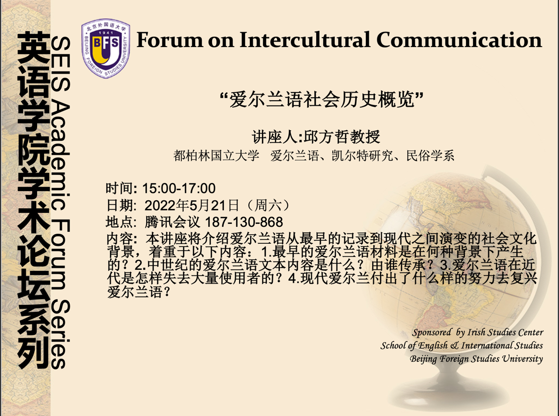 2022年5月21日,爱尔兰都柏林大学学院助理教授邱方哲做客伊莎白英语讲堂,作了题为“爱尔兰语社会史:从史前到中世纪”学术讲座。讲座由北外pg国际电子网站爱尔兰研究中心教师张珺涵主持。英院爱尔兰研究的学生、爱尔兰语三外学习者、其他院系对爱尔兰有兴趣的学生、以及校外师生等110余人参与了本次讲座。