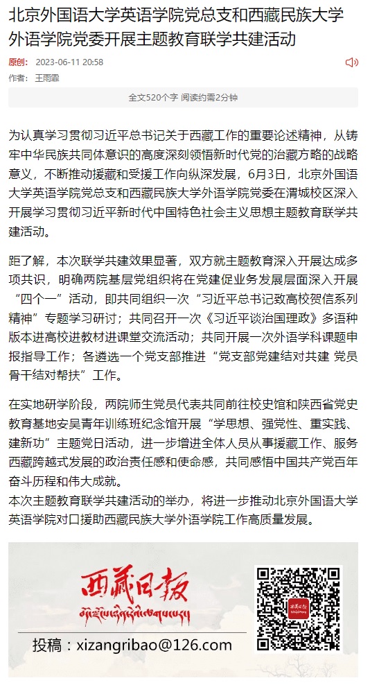 6月11日,西藏日报报道北外pg国际电子网站党总支与西藏民族大学外语学院党委主题教育联学共建活动。