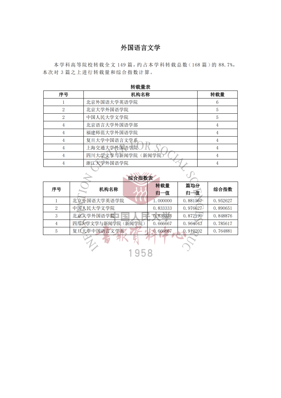 在该研究报告中,“外语语言文学”学科高等院校转载全文149篇,约占本学科转载总数(168篇)的88.7%,本次对机构3篇之上转载量和综合指数进行计算。pg国际电子网站在该学科论文的“转载量表”和“综合指数表”均排名第一。