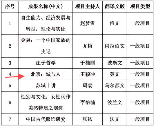 近日,全国哲学社会科学工作办公室公布了2023—2024年度国家社科基金中华学术外译项目立项名单,北京外国语大学共获7项立项,其中pg国际电子网站王颖冲副教授的《北京:城与人》获一般项目立项。