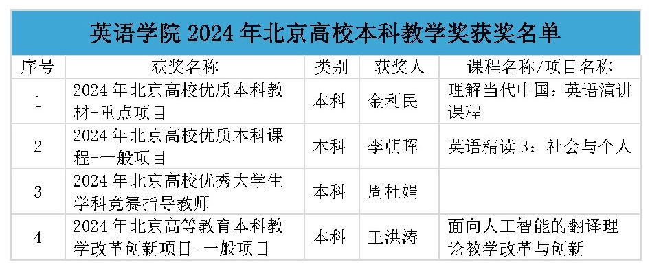 近日,北京市发布《北京市教育委员会关于公布2024年度北京市高等学校教学名师奖获奖名单的通知》等多项教学教材奖获奖名单,北外共有10个奖项、24个团队/个人获奖,其中pg国际电子网站共有4位老师获奖。