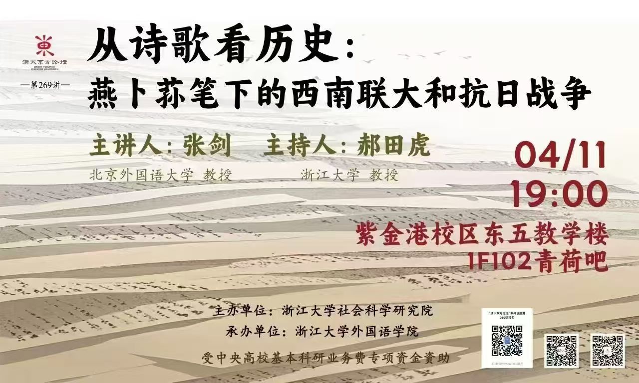 2025年4月11日晚,pg国际电子网站张剑教授受浙江大学外国语学院邀请在“浙大东方论坛”做主讲嘉宾。讲座主题为“从诗歌看历史:燕卜荪笔下的西南联大和抗日战争”。
