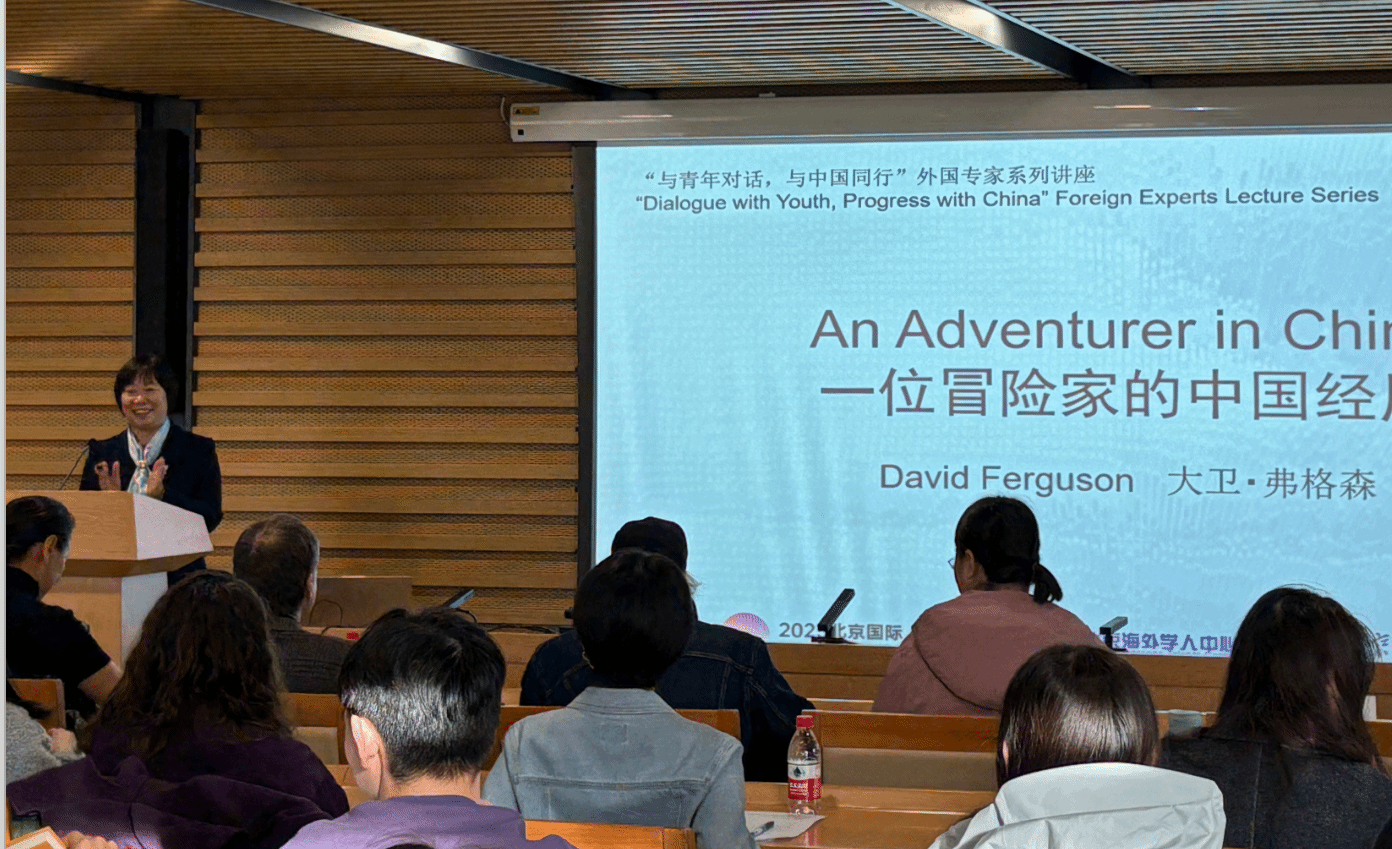 2025年11月12日下午,由北京海外学人中心主办、北京外国语大学承办的“与青年对话,与中国同行”外国专家系列讲座第五场在北京外国语大学图书馆三层报告厅成功举办。本场讲座特邀中国外文局所属外文出版社外籍专家、中国政府友谊奖获得者、2023年首届兰花奖杰出成就奖获得者大卫·弗格森(David Ferguson),以“一位冒险家的中国经历”为主题,分享其在中国工作生活近20年的丰富经历,并就英语写作、翻译实践、人工智能挑战及中国发展理念等议题展开深入讨论,讲座由pg国际电子网站副院长彭萍教授主持,吸引了校内外师生及国际学者近百人参加。