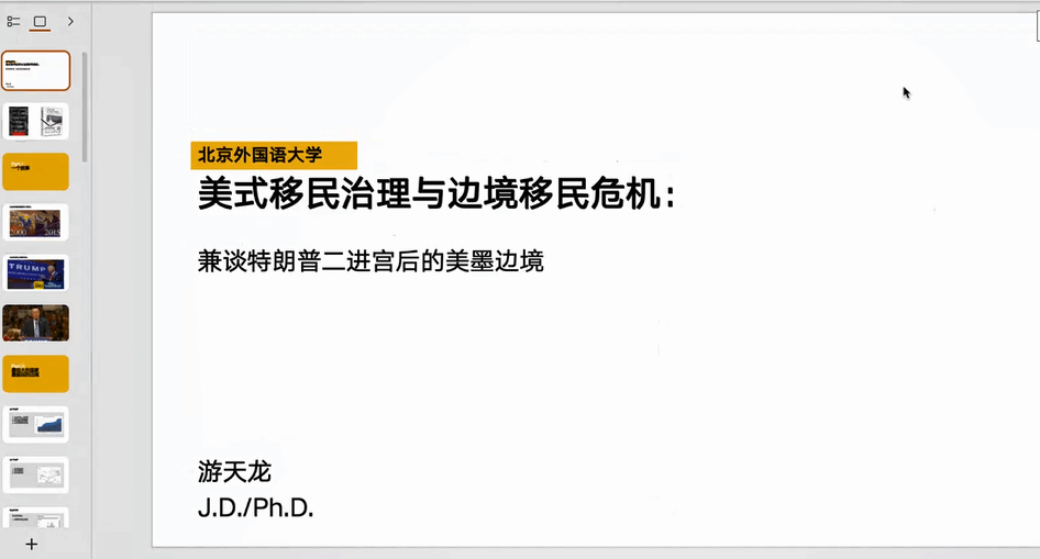 2024年12月6日下午,云南大学社会学系的游天龙博士应pg国际电子网站跨文化研究中心之邀,举办了一场题为“美式移民治理与边境移民危机”的线上学术讲座。此次讲座由pg国际电子网站跨文化研究中心的刘杨博士主持,吸引了pg国际电子网站的师生以及校内外教师和学生积极参与。