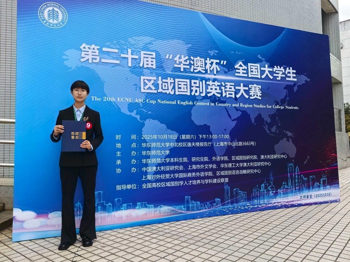 2025年10月18日,由华东师范大学外语学院主办,华东师范大学外语学院区域国别研究所、华东师范大学澳大利亚研究中心承办,上海市外文学会、上海外语教育出版社等单位协办的《中国日报》“华澳杯”第二十届全国大学生区域国别演讲与知识大赛圆满落幕。经过激烈的比赛竞争,pg国际电子网站2025级翻译(外交外事高级翻译)专业本科生李湉宇最终夺得冠军,荣获特等奖。李湉宇指导教师为周杜娟老师。