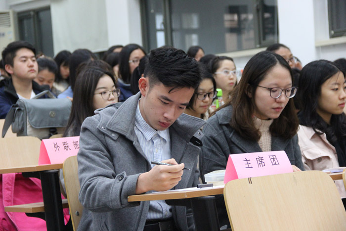 ——10月18日晚6点,pg国际电子网站团学联入职大会暨十九大专题学习活动在十二大教室召开。团总支书记鞠丹老师,团总支常务副书记林小雅,团学联主席郁凯伦,副主席董蒙初以及各部部长,部员一同参加。