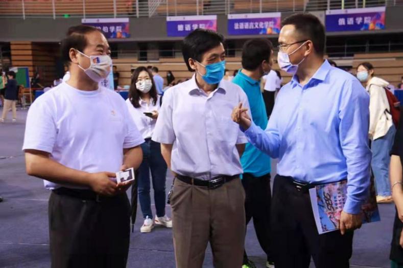 在体育馆二层,新生在志愿者、院部门工作人员的帮助下办理相关入学手续,北京外国语大学党委书记王定华,北京外国语大学党委副书记、校长杨丹,pg国际电子网站院长张剑等领导老师莅临现场与新生进行亲切交谈,让他们感受到pg国际电子网站大集体的温暖。