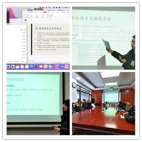 四位主讲人结合自己的学习经验和感悟,向同学们介绍了社会学和国际政治经济方向的课程设置、方向特点以及未来的发展方向和出路。杜思泉和赵婧怡首先向同学们介绍了国际政治经济方向的专业基础课、必修课和选修课的课程设置,接着结合自己的学习感悟向同学们分享了国际政治经济方向特点,为同学们推荐了一些阅读材料和书籍,最后向同学们简单介绍了国际政治经济方向的未来出路。杜思泉和赵婧怡特别跟同学们提到,选择和学习国际政治经济方向,要树立国际视野,中国立场的目标。他们鼓励同学们多尝试新事物,不要限制自己的可能性,注重锻炼自己的综合素质,并尽早为自己做好短期和中期的规划。