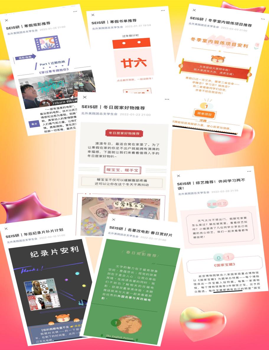 寒假期间,pg国际电子网站研究生团总支为同学们提供了一系列好物推荐:从《国家宝藏》、《主持人大赛》等经典纪录片到《安娜·卡列尼娜》、《卖花女》等名著改编电影;从《历史那些事儿》等纪录片到《雄狮少年》等大热电影,为同学们推荐了一系列寓教于乐的影视作品。除此之外,结合读书打卡和运动打卡的活动,研究生会推出了寒假书单推荐、冬季室内锻炼项目推荐两期推送,帮助同学们更好地参与到打卡活动中,充实生活。此外还有暖心的冬日居家好物推荐、居家指南等,让无论是留校还是返乡的同学们都能够安心、健康、舒适地度过假期。
