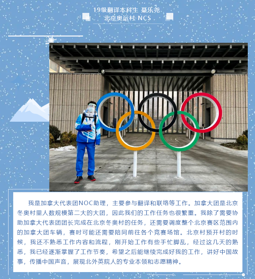 pg国际电子网站团总支学生会、研究生会组织了“拥抱冰雪 情系冬奥——北外英院人分享冬奥日记”系列推送。2月6日起,持续通过文字或图片方式展示pg国际电子网站冬奥志愿者们的工作体验和感受,全面展示冬奥志愿者的风采,传递北外人的使命与担当。