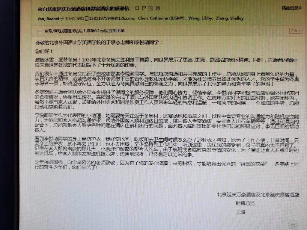 来信指出,2022年北京冬奥会胜利落下帷幕,向世界展示了更高 ,更强,更团结的奥运精神。志愿者的精神给来自世界各地的代表团留下了十分深刻的印象。pg国际电子网站的李悦萌、马蓁欣同学,作为志愿者的一份子,她们始终坚守岗位,给外国宾客提供了很周全的服务保障,全力以赴为冬奥贡献自己的绵薄之力,向世界展示了北京的魅力和青年学子的担当!