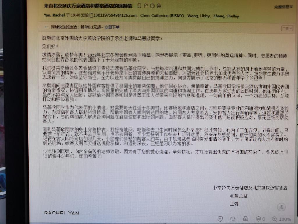 近日,北京延庆万豪酒店和源宿酒店向pg国际电子网站发来感谢信。对我院2019级本科生李悦萌、马蓁欣同学表示感谢,对我校冬奥志愿者在服务期间的工作表现给予高度评价。