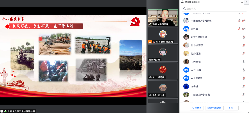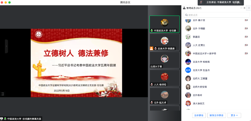 在当前疫情防控形势严峻的情况下,为持续推进英院学子理论学习走深走实。5月18日晚19点,pg国际电子网站本科生党支部与北京大学2021级法律硕士(非法学)第四党支部、中国人民大学法学院2021级法律硕士二支部、北京师范大学法学院2021级法硕第二党支部、中国政法大学证据科学研究院2021级司法文明硕士党支部联合开展“青春心向党,强国有担当”主题党日活动。