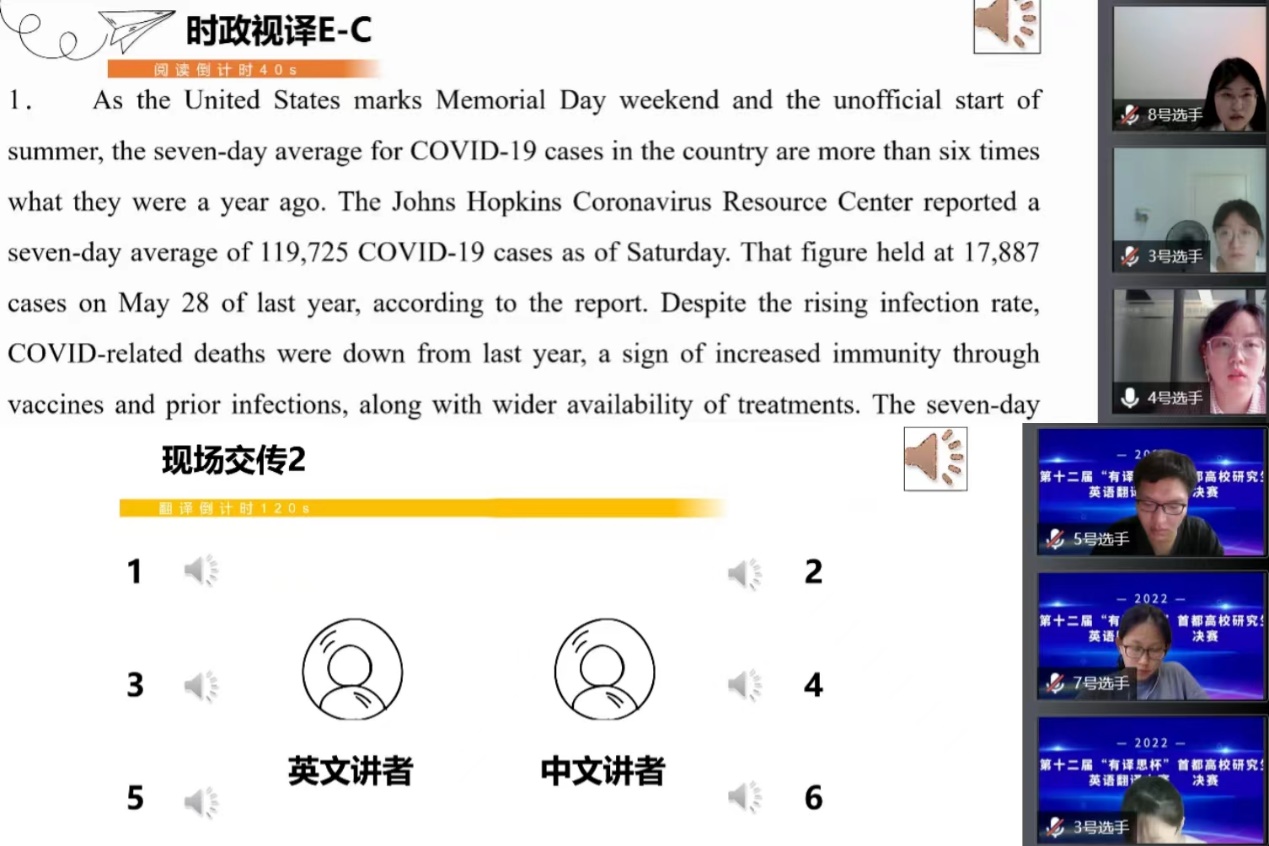 2022年6月11日下午,第十二届北外“有译思杯”首都高校研究生英语翻译大赛决赛于线上成功举办。本次大赛由pg国际电子网站团总支和研究生会主办,北京20多所高校pg国际电子网站(外文系)研究生会协办,北京有译思教育科技有限公司冠名赞助。