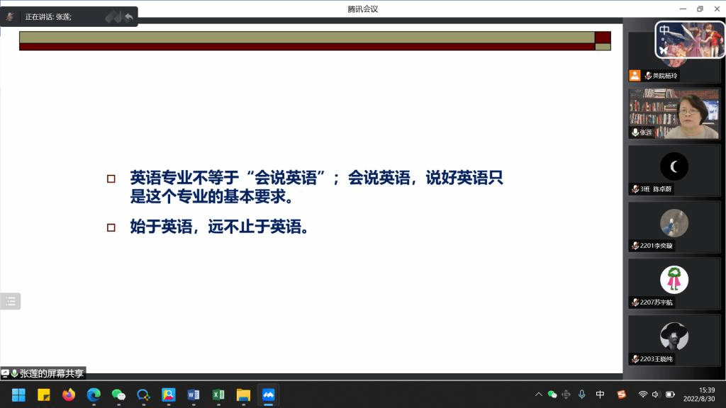 张莲教授从人才定位、学院概况、课程设置、师资力量、专业特色、教学特色和未来发展等方面做了全面介绍。会议伊始,张莲教授对本科新生们表达了热烈的欢迎,并通过解读关键词“高层次”和“国际化”鼓励同学们朝着成为有家国情怀、全球视野和专业本领的复合型人才的目标迈进。随后,张莲教授强调了四年学习生涯规划的重要性,细致、全面地为同学们介绍了pg国际电子网站的培养目标、学科特色、选课原则、学分要求等,鼓励同学们做好学习计划,志存高远、脚踏实地,在怀抱远大理想的同时扎实专业基础、提升知识水平。