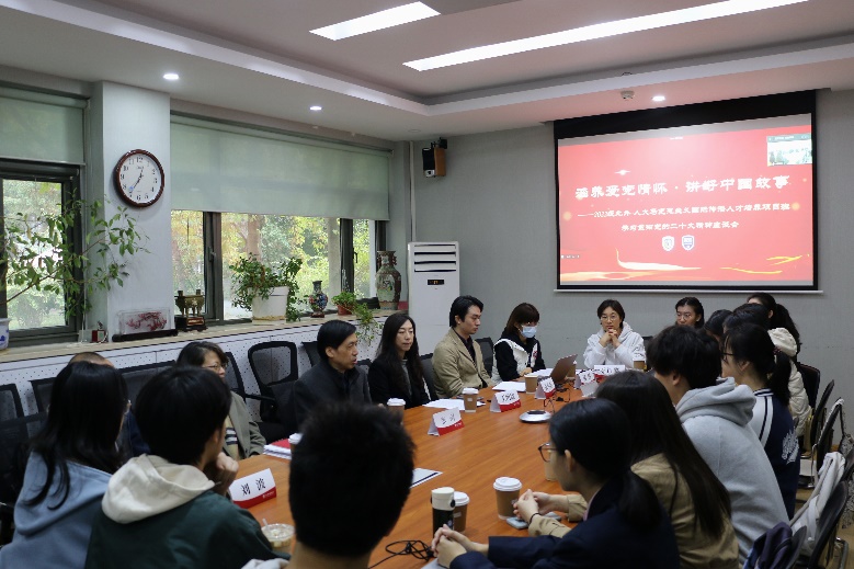 为学习贯彻党的二十大精神,10月30日,pg国际电子网站召开“涵养爱党情怀·讲好中国故事——推动中国化马克思主义国际传播”主题座谈会。pg国际电子网站党总支书记王明欣,院长张剑,副院长张莲,英语系副主任张小东,教师代表刘波,教务秘书王红婴、陈照,辅导员杨玲以及2022级北外-人大21世纪马克思主义国际传播人才培养项目班全体同学参会,座谈会由党总支书记王明欣主持。