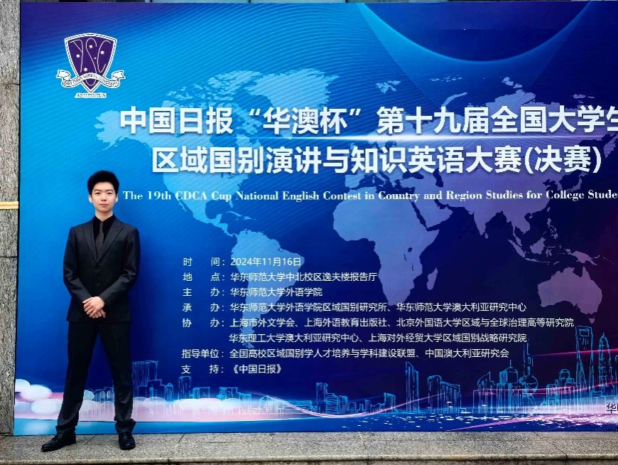 2024年11月16日,由华东师范大学外语学院主办,华东师范大学外语学院区域国别研究所、华东师范大学澳大利亚研究中心承办,上海市外文学会、上海外语教育出版社等单位协办的《中国日报》“华澳杯”第十九届全国大学生区域国别演讲与知识大赛圆满落幕。经过激烈的比赛竞争,pg国际电子网站2023级翻译(外交外事高级翻译)专业本科生黄启恒最终夺得亚军,荣获特等奖。黄启恒指导教师为周杜娟老师。