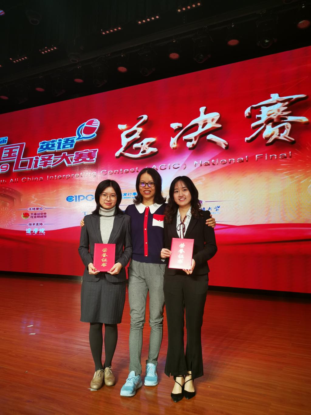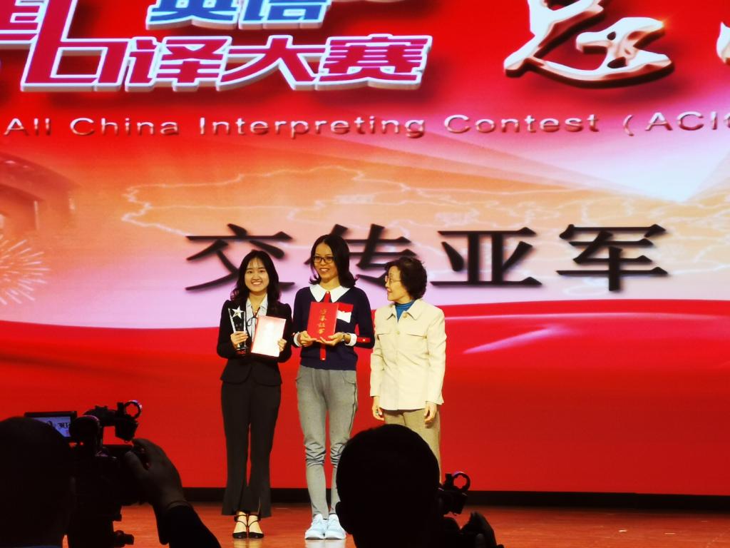 第八届全国口译大赛(英语)总决赛于2019年10月18日至19日在北京外国语大学千人礼堂举行。经过两天的激烈角逐,我院学子取得优秀成绩。其中,金羽菲同学获交传亚军、同传邀请赛二等奖,尹佩璇同学获交传二等奖,侯玉颖同学获交传三等奖,王颖冲老师获优秀指导教师奖。pg国际电子网站毕业生、口译俱乐部队员王静怡获得交传冠军和同传季军。