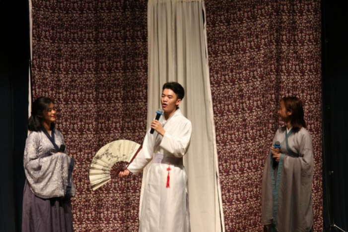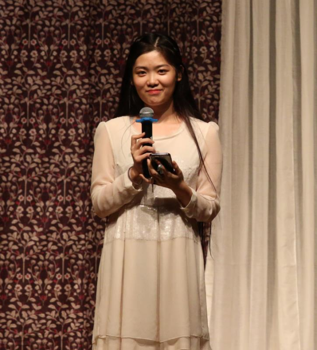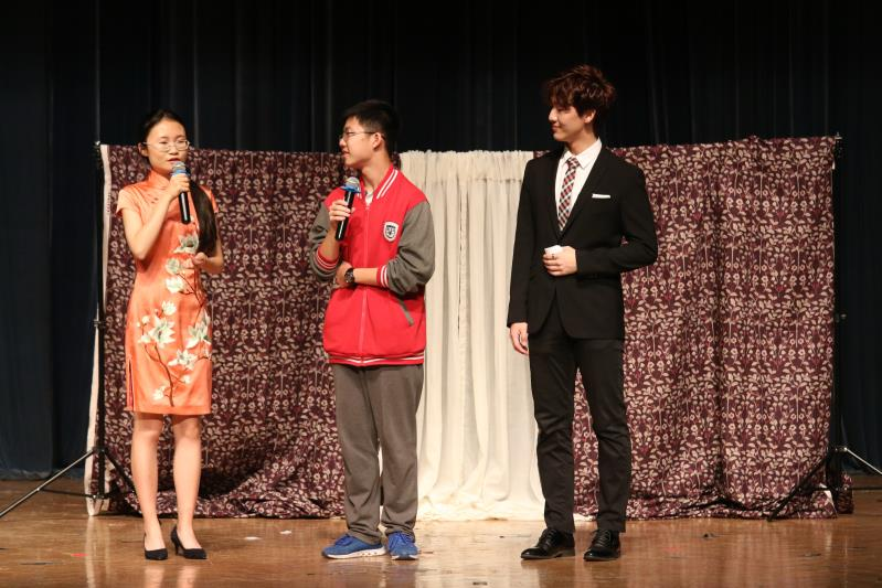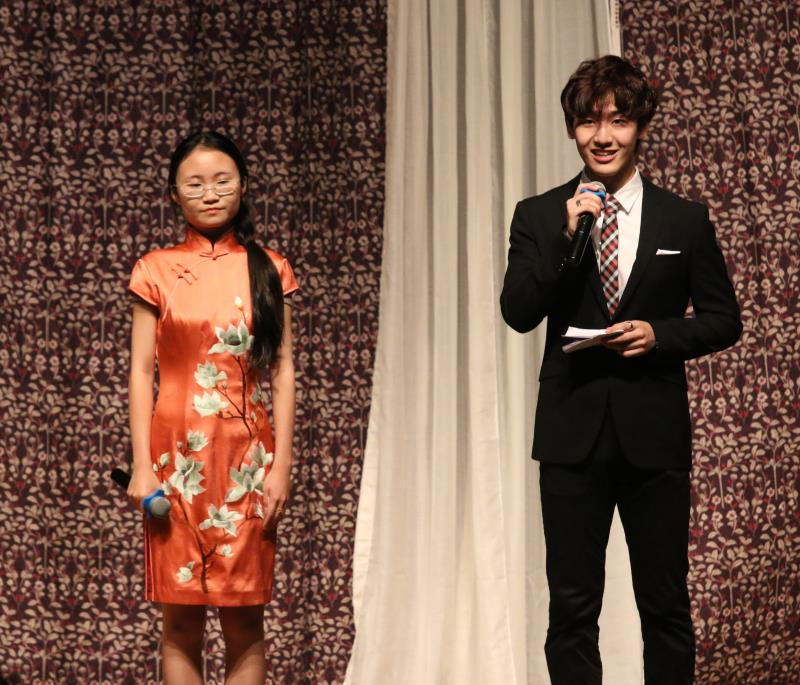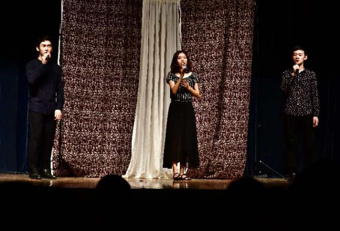 当晚的节目由英院15级本科生薛雨彦与胡馨友主持,节目中的双语版中国古风歌曲《东风志》为绿萝剧社负责人邵雪萍指导的国家级大学生创新项目“中国古风歌曲的翻译与传播”的阶段性成果,由来自pg国际电子网站、国际新闻传播学院、中国语言文学学院的中外学生共同演唱,中英文歌词的和谐交织与演唱者的动人歌喉令观众掌声雷动。