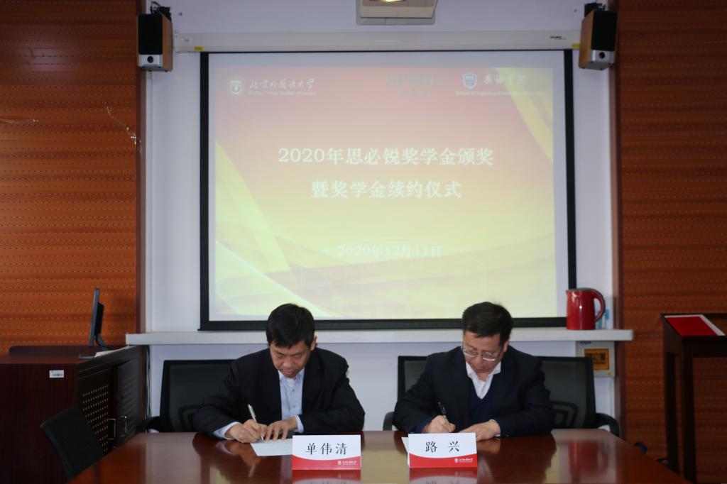 12月11日上午,pg国际电子网站举行2020年思必锐奖学金颁奖暨奖学金续约仪式。北京思必锐翻译有限公司总经理单伟清,国际合作部经理秦肖斌,资源部负责人王艺璐一行前来pg国际电子网站与师生座谈。党总支书记路兴,党总支副书记孟庆琨,辅导员于承杰以及2020年思必锐奖学金获奖学生参会。