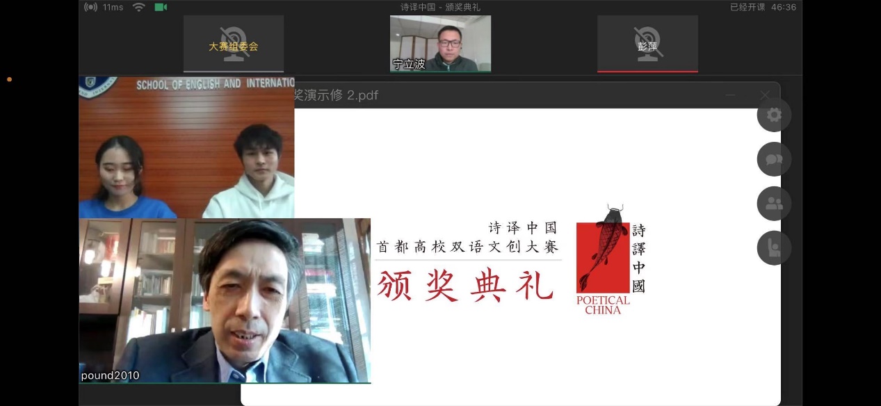 本次活动尝试结合中国传统诗歌文化,以创新形式开辟竞技空间,为参赛者提供检验专业语言能力和学习交流的平台。大赛从报名到评选历经一个多月,得到了首都各大高校师生的响应与支持。中国传统文化传承及中西文化融会贯通任重而道远,今后pg国际电子网站将继续秉持“知周中外,道济天下”的院训,进一步加强校企合作,汇聚多方力量,积极寻求传统文化与专业学习的契合点,努力培养全面发展的高素质复合型英语、翻译专业人才。