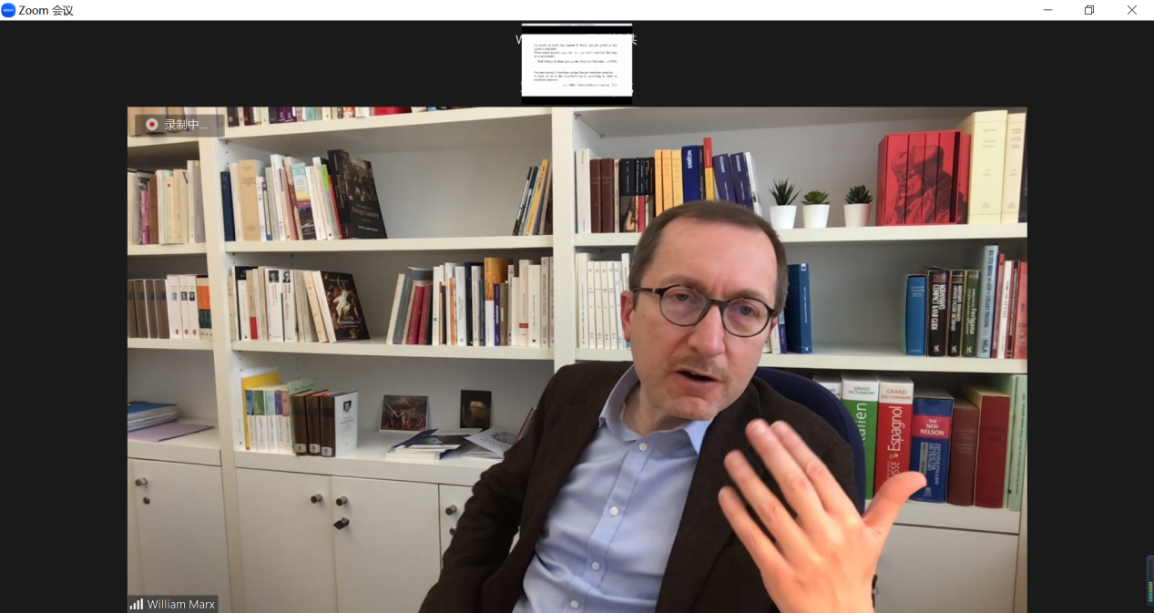 4月20日晚,欧洲科学院院士、法国法兰西公学院比较文学教授威廉·马克思教授,应pg国际电子网站邀请通过Zoom带来了一场题为《世界图书馆:一个超越世界文学的概念》的精彩讲座。讲座由pg国际电子网站英美文学研究中心主任黄强主持。