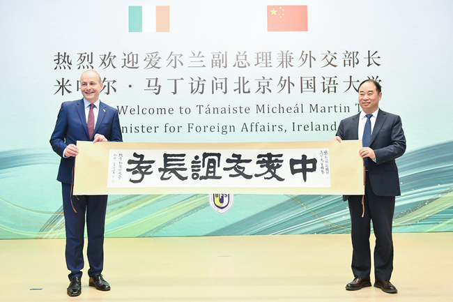 11月8日,爱尔兰副总理兼外交部长米哈尔·马丁访问北京外国语大学并发表演讲,与中外师生进行对话交流。北外党委书记王定华出席活动,活动由党委副书记、副校长贾文键主持。