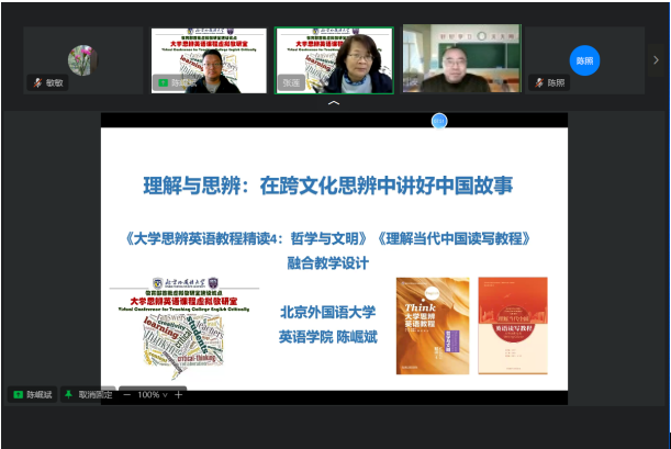 12月20日,大学思辨英语课程虚拟教研室以“理解与思辨:在跨文化思辨中讲好中国故事—《大学思辨英语精读4:哲学与文明》《理解当代中国读写教程》融合教学设计”为主题举办了本学期第三次活动,来自全国高校1200余位老师线上参加本次活动。pg国际电子网站陈崛斌副教授进行了主题分享。他分享了自己在英语教学中探索理解当代中国系列教材与大学思辨英语系列教材融合的创新教学模式经验,并深入浅出地讲解了如何在专业英语教学中融入中国元素、中国故事,帮助学生更好地理解和传播中国文化。最后,陈崛斌副教授还与参会教师进行了互动讨论,分享了自己的教学经验和心得。他的演讲内容丰富、生动有趣,引起了广大教师的共鸣和思考。
