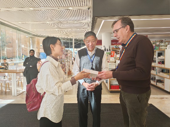 (实践团带队教师江璐向图书馆馆长Richard Neville赠书)