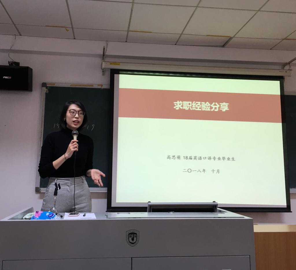 第一位上台的龚圆梦学姐,就职于外研社教学服务部。学姐幽默开场,抛出“高薪不喜欢的工作和低薪喜欢的工作,你选哪个?”的问题,引人思考。接着向大家推荐51找翻译、寻翻译、梧桐果等众多求职微信公众号。根据与所在单位人事部门同事的交流,学姐向大家分享了简历制作和无领导小组讨论的经验,内容包括:1、找准方向。面试之前充分了解自己,不迷信所谓的面试“套路”;2、投资学习,空杯心态。学姐建议大家根据“值不值得”去选择工作,而不是执迷于“喜不喜欢”,要从工作中提升自己;3、不要被别人带着走,要保持自己的节奏;4、船到桥头自然直,要放平心态,顺其自然。