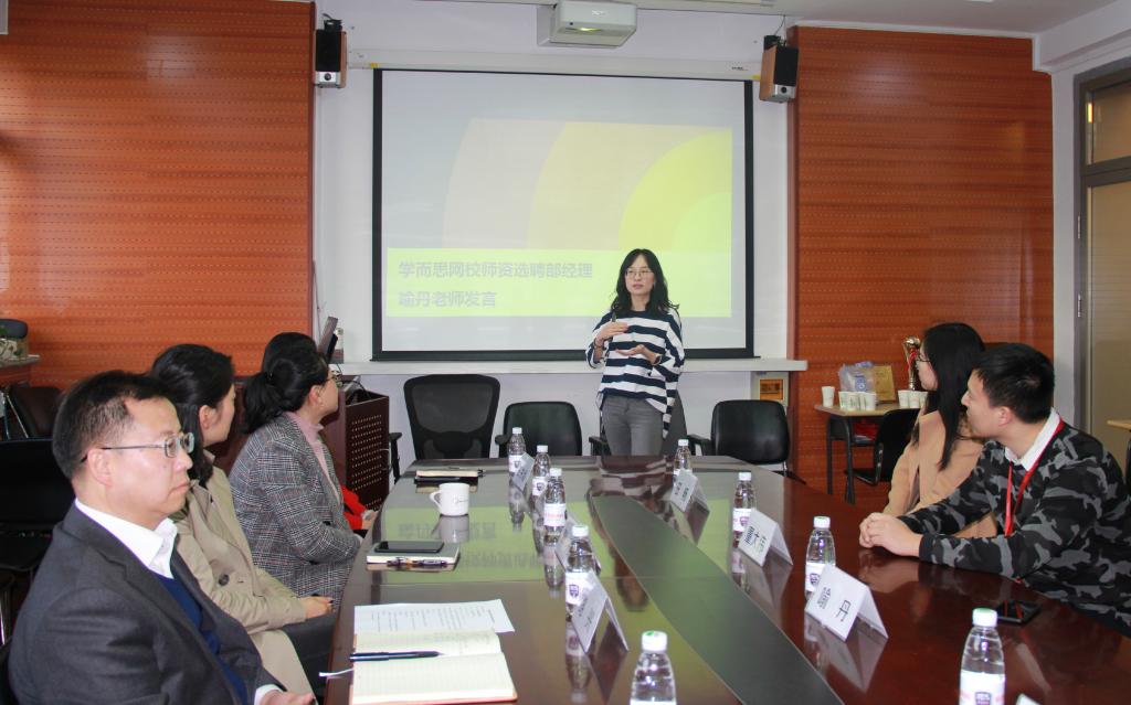 学而思网校选聘部经理喻丹女士介绍了网校的发展前景以及毕业生招聘、校企合作等基本情况。pg国际电子网站党总支书记路兴介绍了学院基本情况和人才培养目标、学生实习实践需求等。校友代表田畅和毕业生代表陈阳分别就自身职业选择以及在学而思网校的工作情况、培训经历与大家进行交流分享。