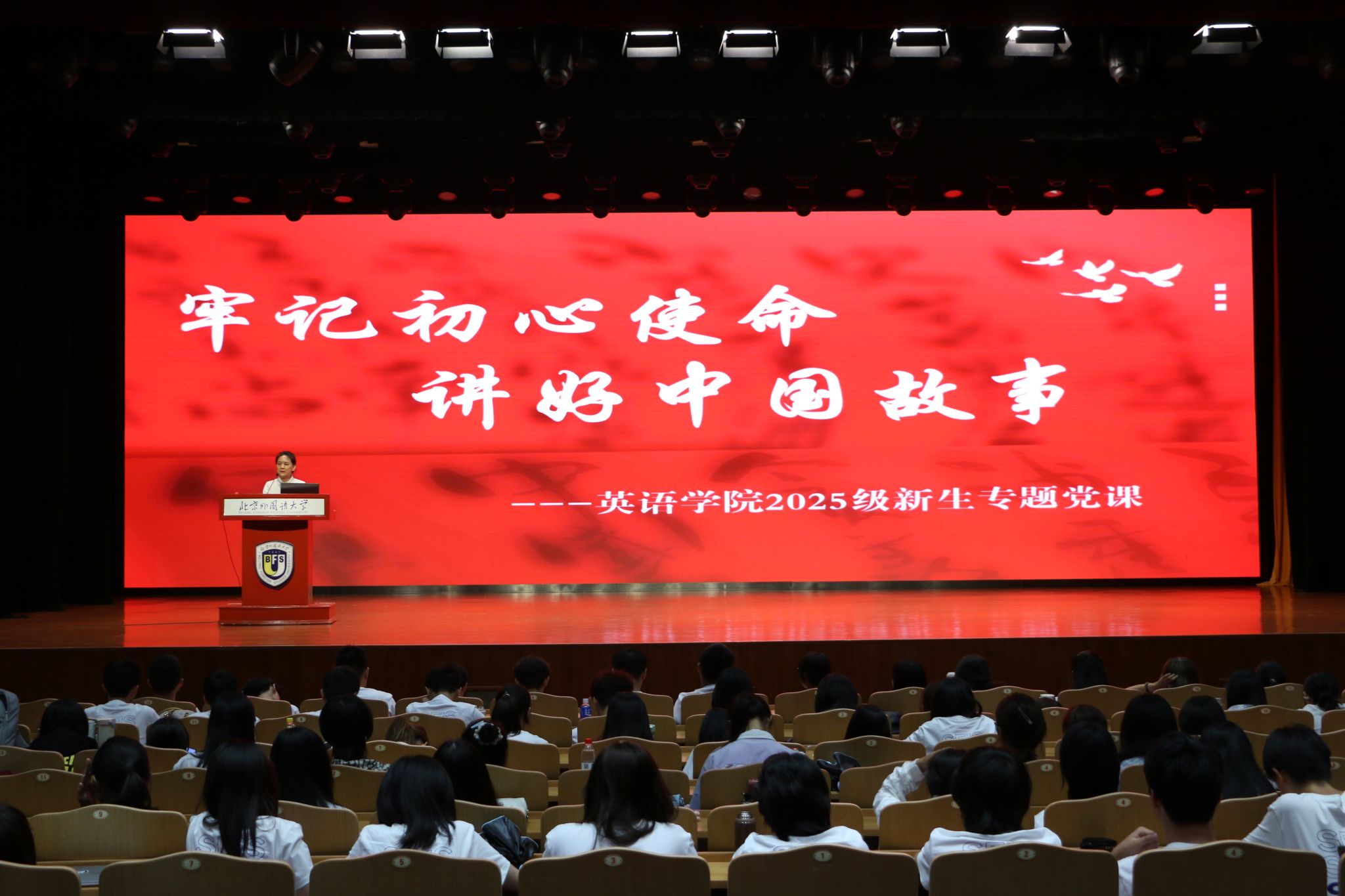 9月5日下午,在pg国际电子网站2025级新生开学典礼最后,学院党总支书记殷悦以“牢记初心使命,讲好中国故事”为题,为全体2025级本科生及研究生新生讲授专题党课。