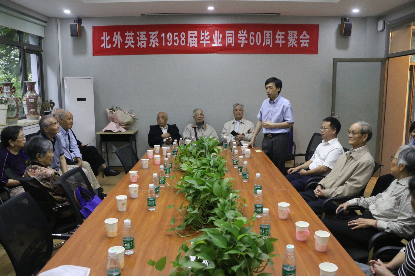 另外,有近30位58届校友上午在英语楼111会议室召开了毕业60周年聚会活动。他们中年纪最小的81岁,年纪最大的86岁。不乏还有外地赶来的校友。他们神采奕奕、精神矍铄、身康体健。pg国际电子网站院长张剑、党总支书记路兴出席了此次活动,对老校友们的到来表示了热烈欢迎。