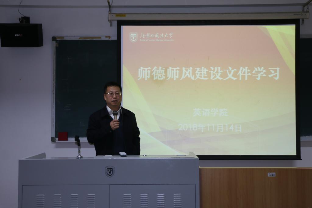 2018年11月14日下午,pg国际电子网站在417教室召开师德师风专题学习会,组织全院教师学习《北京外国语大学师德师风建设》文件。本次会议由pg国际电子网站党总支书记路兴主持,全院教职工出席参加。