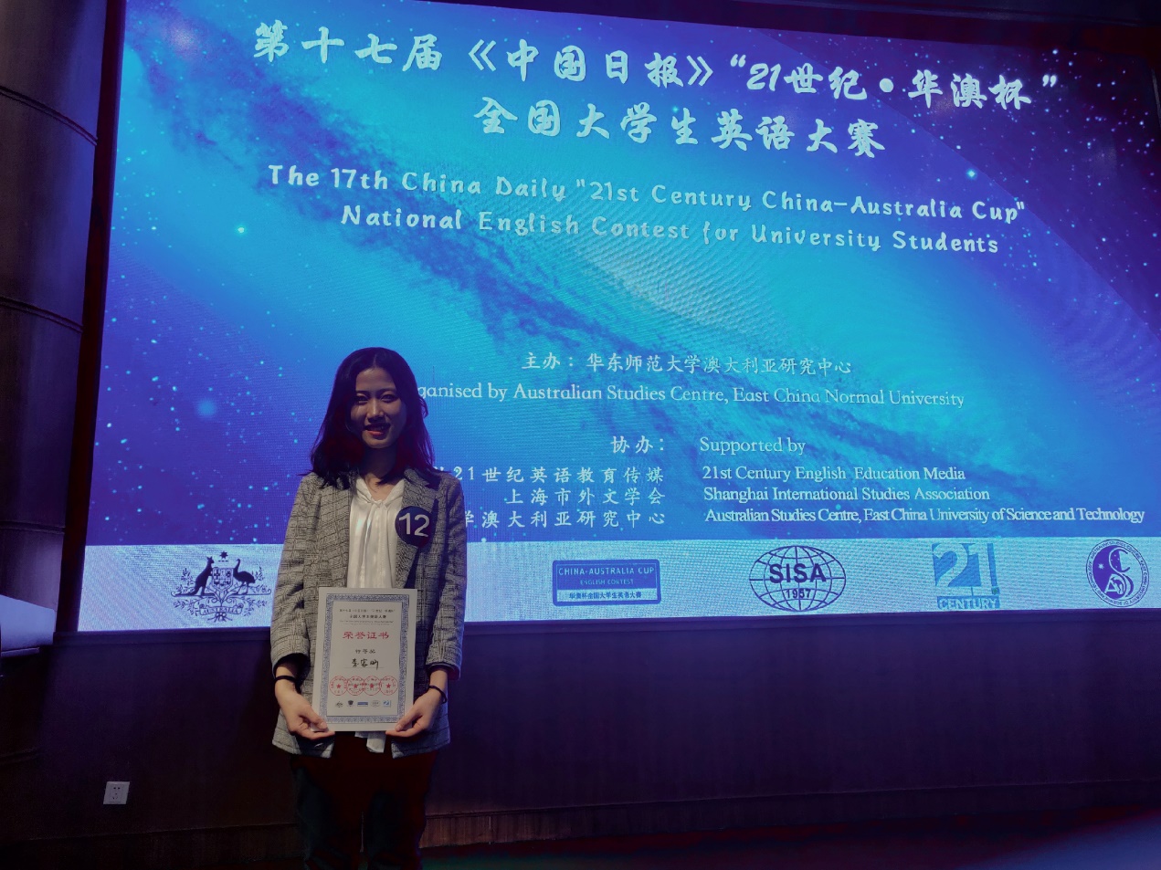 12月7日,由华东师范大学澳大利亚研究中心主办,中国日报21世纪英文报、上海市外文学会、华东理工大学澳大利亚研究中心协办的第十七届《中国日报》“21世纪·华澳杯”全国大学生英语大赛圆满落幕。我校pg国际电子网站2017级本科生李家昕在26所高校选手中脱颖而出,夺得冠军,荣获特等奖。周杜娟老师获最佳指导老师。