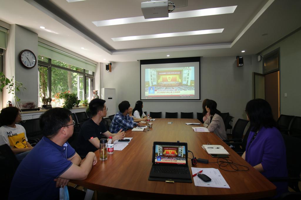 2020年5月22日上午9时,十三届全国人民代表大会第三次会议在人民大会堂开幕。pg国际电子网站教职工行政党支部党员们在英语楼111会议室集体收看学习大会开幕式,认真聆听李克强总理关于政府工作的报告,第一时间学习领会大会精神。