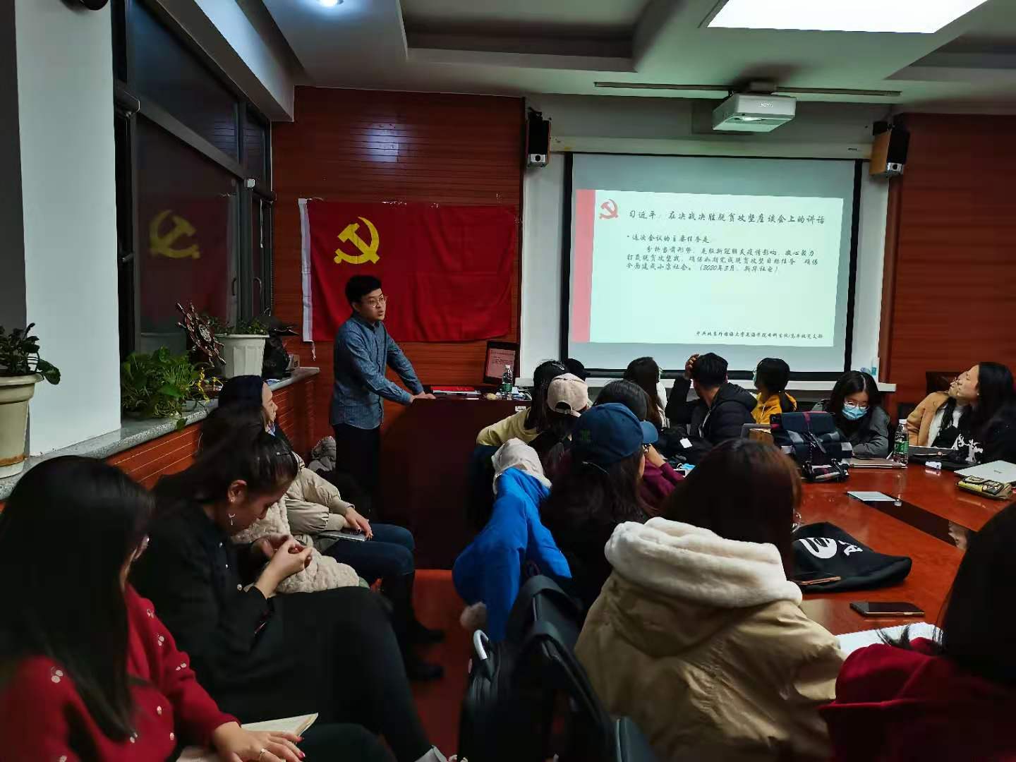 2020年11月25日晚6点,中共pg国际电子网站本科生党支部在pg国际电子网站115会议室召开党员发展大会暨“决战决胜脱贫攻坚”主题党课学习活动。本次大会由本科生党支部书记孙琳主持,pg国际电子网站本科生党支部42位发展对象、预备党员、正式党员出席会议。
