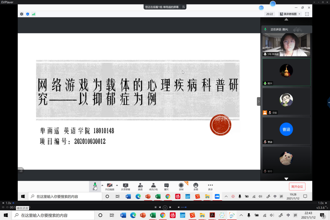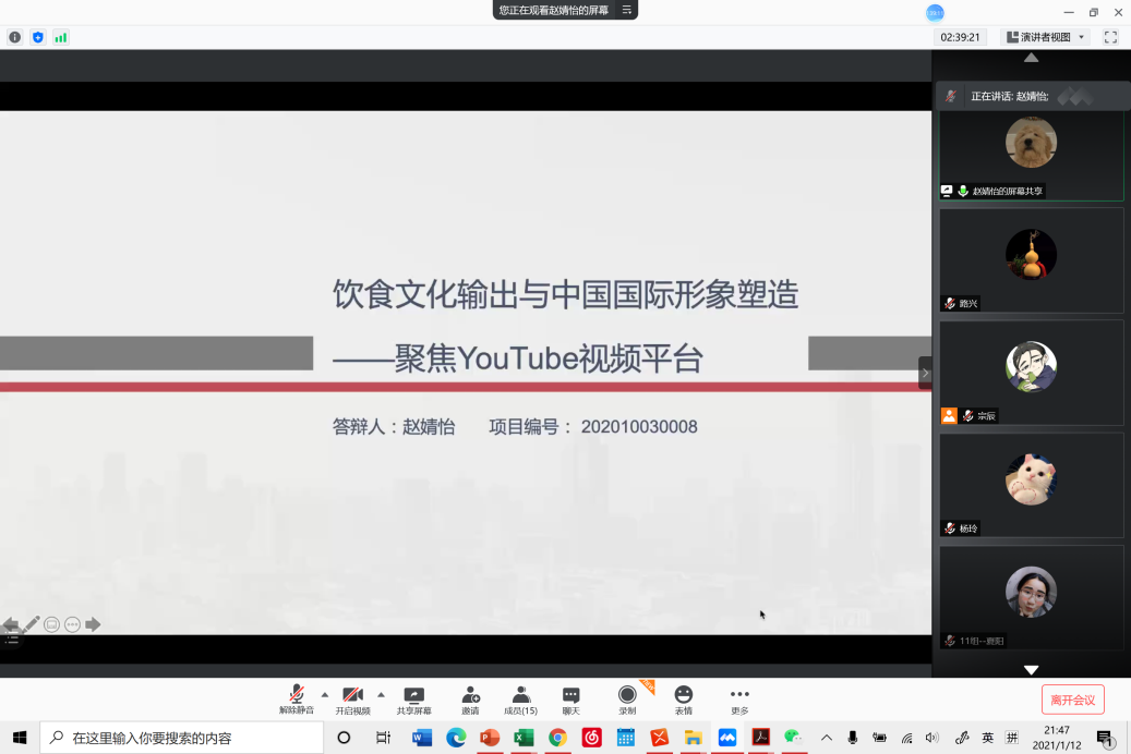 本次答辩会共有3个国家级项目、3个市级项目、5个校级项目。在答辩过程中,同学们都根据自己的选题内容,从项目介绍、研究方法和目标、研究进展、经费使用情况、存在的问题,以及后期研究计划进行了汇报。在选题方面,有的项目从讲好中国故事,弘扬中国文化方面入手,讲述中国式摔跤、侗族大歌、武当武术等中国传统文化;有的项目紧跟时事开展调查研究,如疫情期间,青年企业家的经营之道等。还有一部分项目从心理学、社会学、教育学等领域出发,结合自己的专业领域,围绕选题开展比较系统的学术研究。