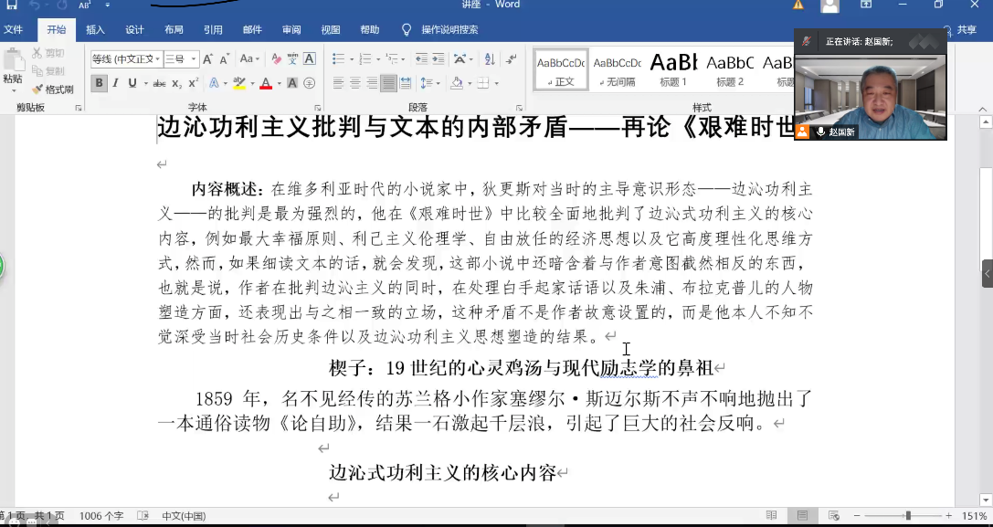 2021年2月2日晚,pg国际电子网站“边沁功利主义批判与文本的内部矛盾——再论《艰难时世》”专题讲座如期举办。本次讲座邀请到pg国际电子网站赵国新教授为同学们分析文学作品中所体现的边沁功利主义及其内部矛盾,帮助同学们理解丰富的文学知识、提升文学素养。