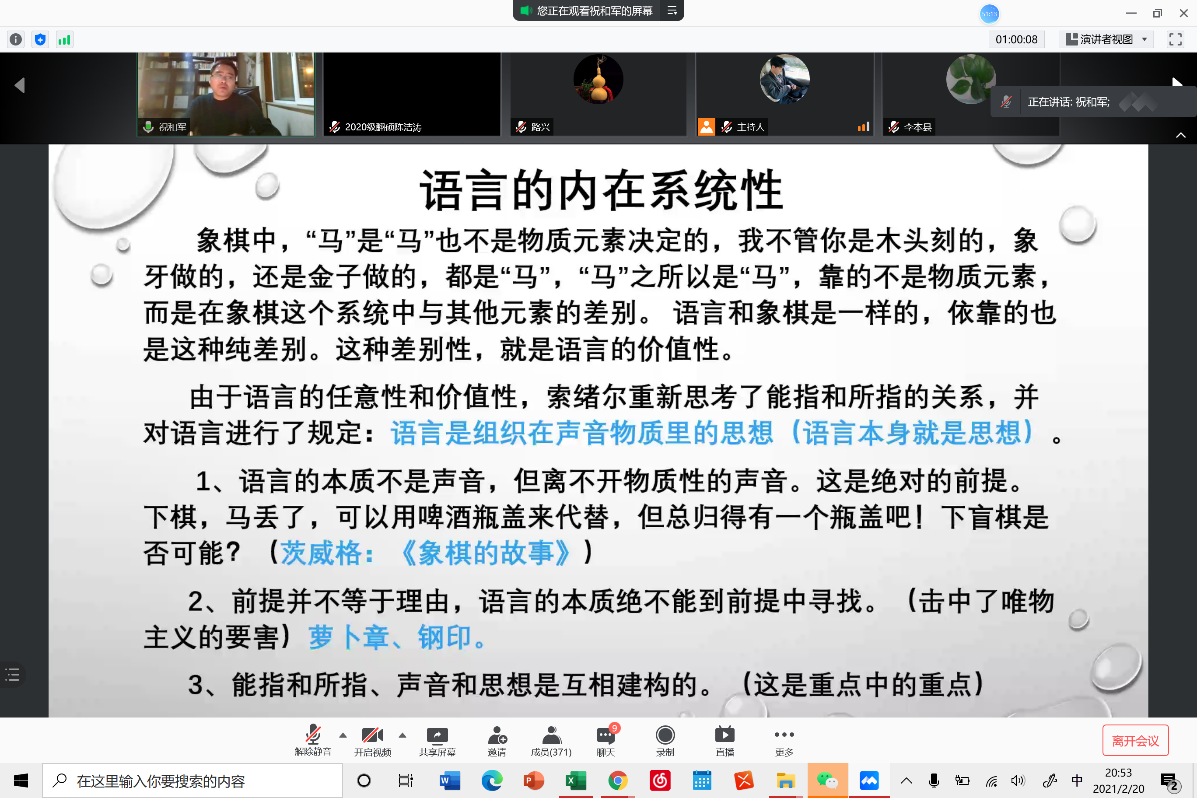 2021年2月20日晚,pg国际电子网站于腾讯会议成功举办“《普通语言学教程》导读”线上讲座。本次讲座邀请到我校马克思主义学院党总支书记祝和军副教授,为同学们解读索绪尔著作《普通语言学教程》,并就语言结构和文化差异和大家展开讨论。