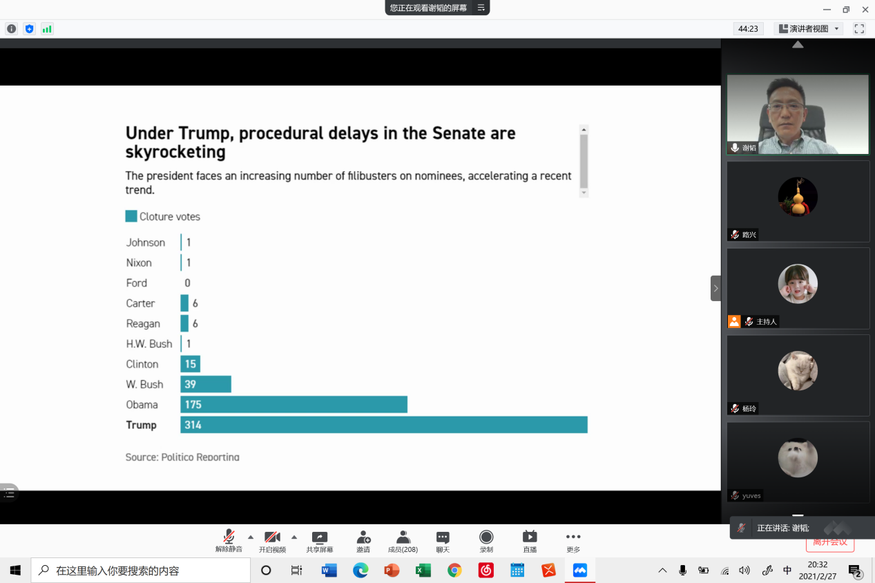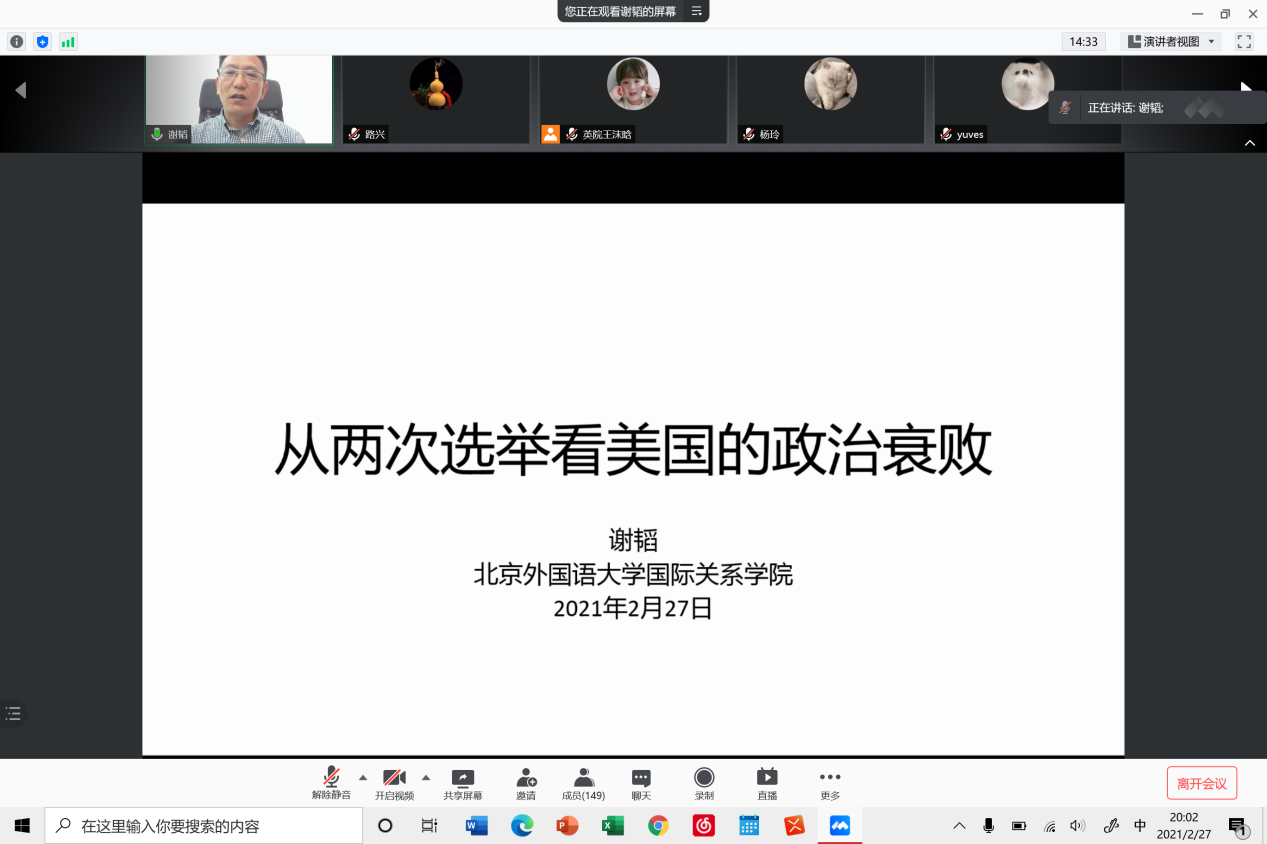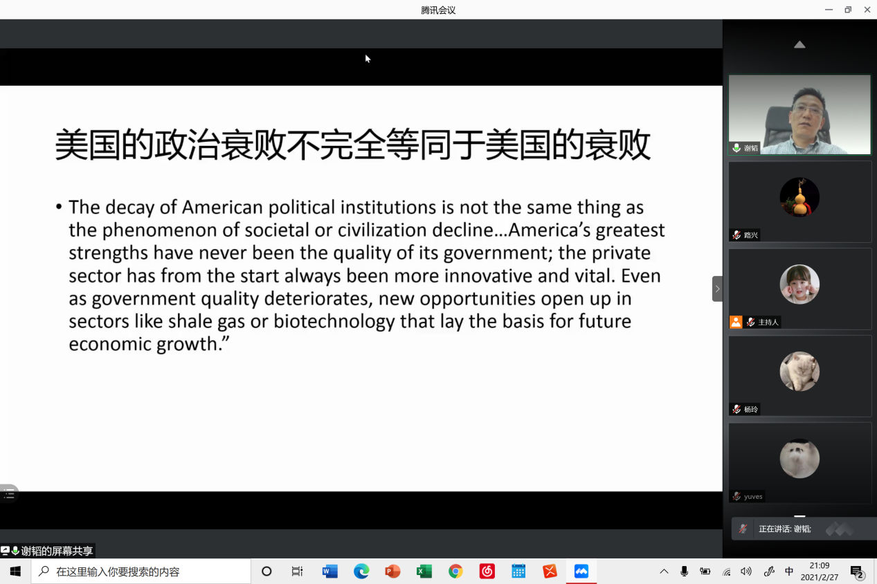 2021年2月27日晚,pg国际电子网站通过腾讯会议成功举办“从两次选举看美国的政治衰败”主题线上讲座。本次讲座邀请到我校国际关系学院院长、博士生导师谢韬教授为同学们剖析美国政治的形势与走向。