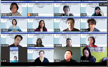 为落实校教务处关于抽查2020-2021学年秋季学期期末考试试卷通知,规范期末考试试卷管理工作,pg国际电子网站于2021年3月18日召开2020-2021学年秋季学期期末考试试卷自查汇报线上会议。院长张剑、副院长张莲、彭萍、英语系副主任张小东,以及本科各教研室主任、方向负责人及课型组长、教务秘书参加了此次会议。